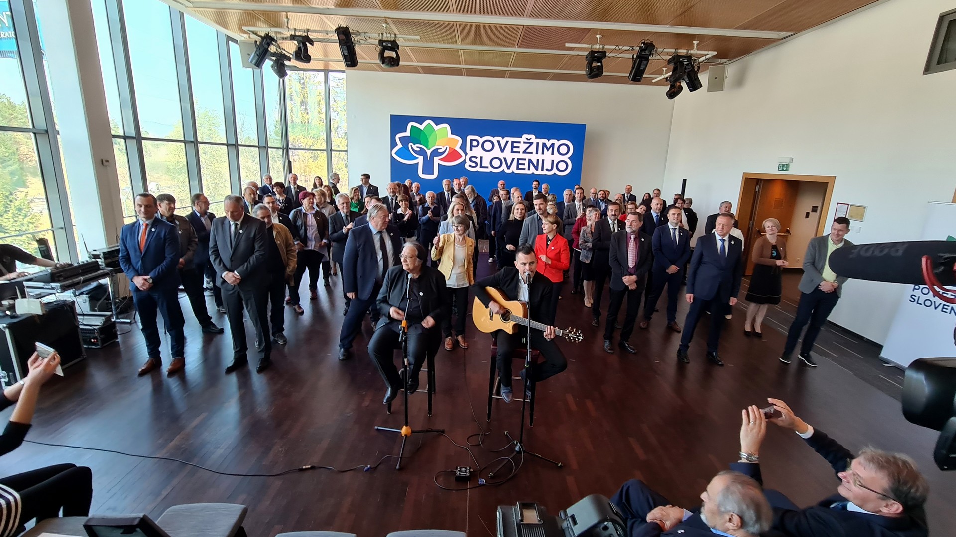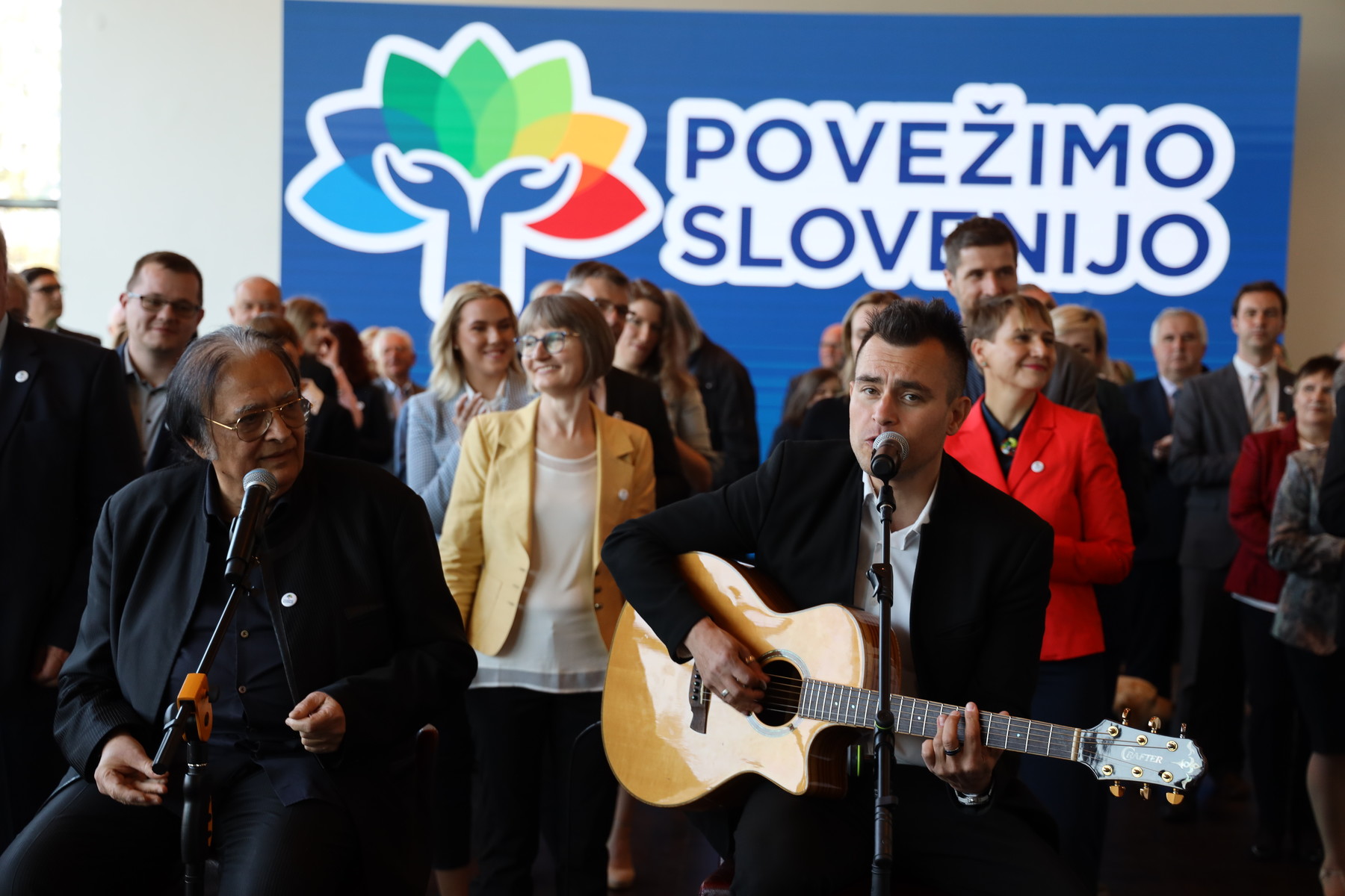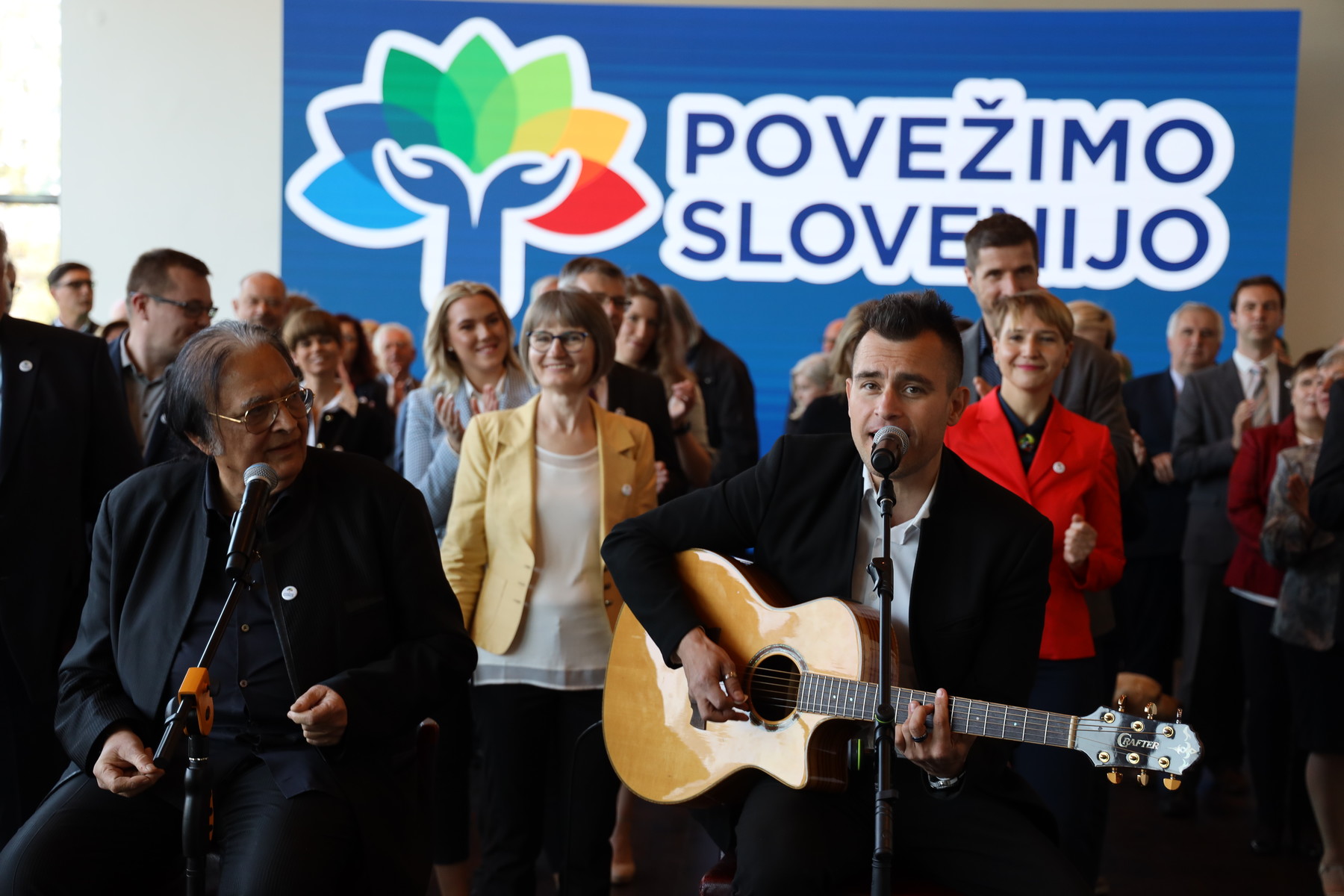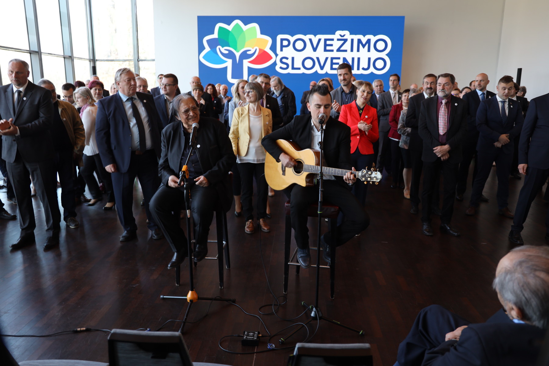 S svojo "himno" Gibanja Povežimo Slovenijo, sta Oto Pestner in Omar Naber poskrbela za vrhunec razpoloženja na predstavitvi kandidatov Gibanja Povežimo Slovenijo (PoS), 26. marca 2022, v Ljubljani